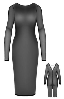 Abito aderente a maniche lunghe con lunghezza al ginocchio. Realizzato interamente in pregiato powernet nero, è trasparente in ogni sua parte e morbidamente elastico. Sensazionale vista posteriore con 2 catene argentate staccabili nella scollatura a V. Sotto, una zip argentata che arriva fino allo spacco dell'orlo. Tglia: S