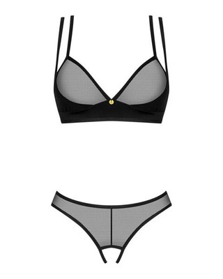 Set composto da reggiseno e perizoma in morbida rete elastica in un mix elegante con materiale elasticizzato opaco. Reggiseno con elemento decorativo tra le coppe e chiusura a gancetto regolabile sulla schiena. Anche le doppie spalline sapientemente incrociate possono essere regolate per adattarsi. Il perizoma in rete seduce con un look ad anello e a strappo sul sedere e cavallo aperto. Taglia: XS S