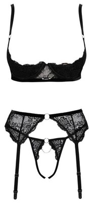 Reggiseno senza coppe, reggicalze e perizoma inguinale. Tutto realizzato in pregiato e morbido pizzo nero elasticizzato con anelli argentati e dettagli in velluto. Tra le coppe sollevabili e nella parte anteriore della stringa aperta, inoltre, è decorato con catenelle e perle, tutte rimovibili. La coppa con ferretto, leggermente foderata, mette in scena il busto in modo eccitante. Le spalline e la chiusura a gancio sulla schiena sono regolabili. Reggicalze in vita con bretelle regolabili e chiusura a gancio sul retro. Il piccolo perizoma in pizzo seduce con il cavallo completamente aperto e il piccolo fiocco sul fondo. Taglia: S