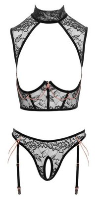 Set composto da top senza seno e slip con reggicalze senza cavallo. Raffinato pizzo nero floreale con dettagli in velluto e catene color oro rosa. Morbido ed elasticizzato su tutta la superficie per un elevato livello di comfort. Top con coppe con ferretto per una perfetta vestibilità senza seno e chiusura con gancio regolabile sul retro. Il colletto con chiusura a gancetto, il pizzo sulle spalle e le spalline regolabili sono completamente staccabili. Così come la catena con cuore gioiello sotto le coppe. Perizoma con reggicalze. Le bretelle sono regolabili e la doppia catena sui fianchi e sulla schiena possono essere rimosse.Taglia: S