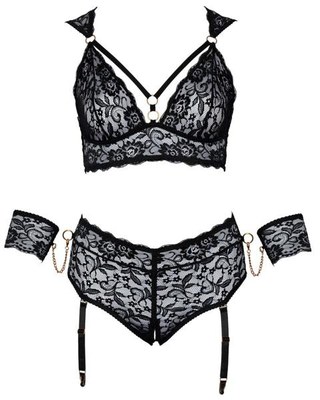 set composto da top, mutandine aperte con reggicalze e polsini staccabili in morbido pizzo elastico. Taglia: 4XL