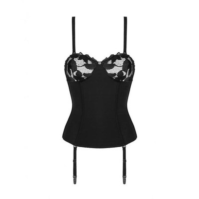 Corsetto con coppe del reggiseno in morbido pizzo: vestibilità perfetta e splendida messa in piega del seno, anelli verticali lungo la silhouette: stilizzano otticamente il corpo, giarrettiere regolabili: vestibilità perfetta, chiusura posteriore: praticità e comfort, giarrettiere rimovibili, slip non inclusi. Taglia: XS - S