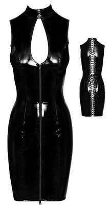 Abito senza maniche in vernice nera lucida. Taglio aderente con zip a 2 vie sul davanti che si apre dalla scollatura e dall'orlo. Colletto con chiusura a bottoni a pressione, profonda scollatura rotonda in basso. Schiena con allacciatura a stringa su tutta la lunghezza. Taglia: L